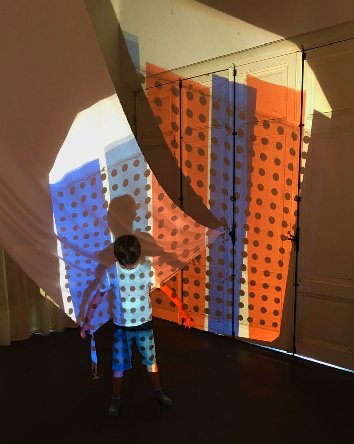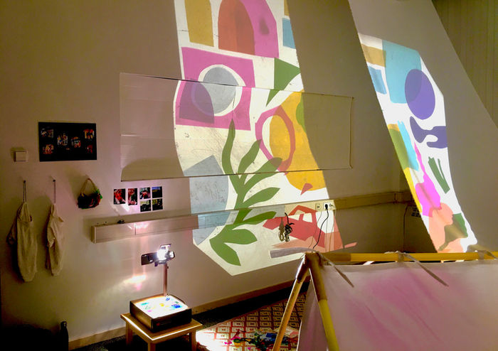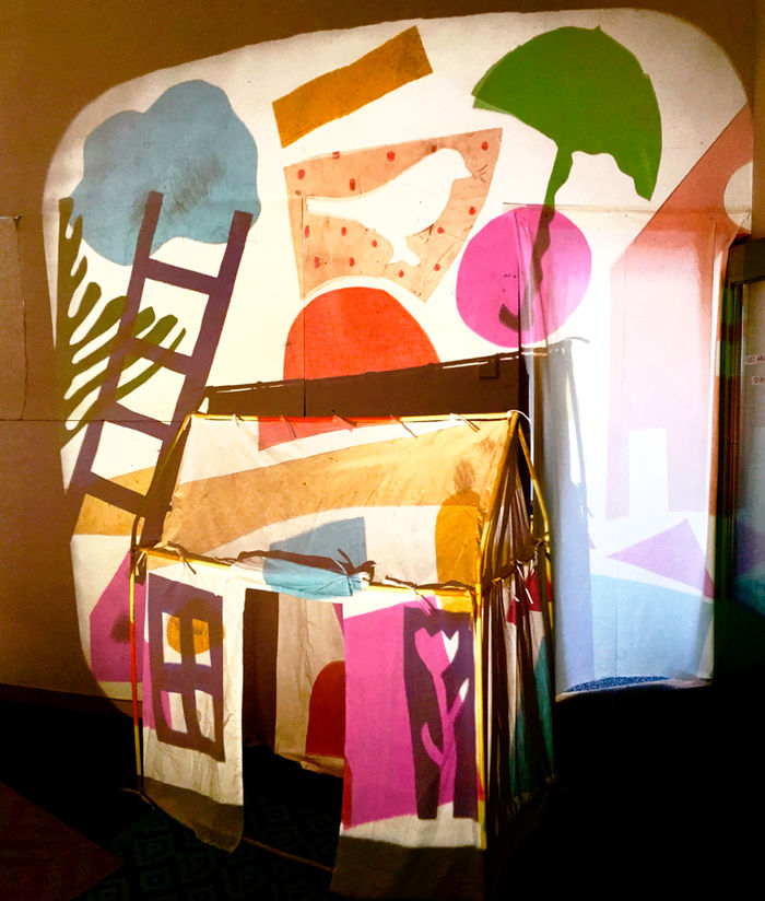 Using overhead projectors, fabrics, colored foils, scissors, markers,mirrors, a handmade- tent and light box, Karin sought to create a space of wonder, discovery, play, and imagination.