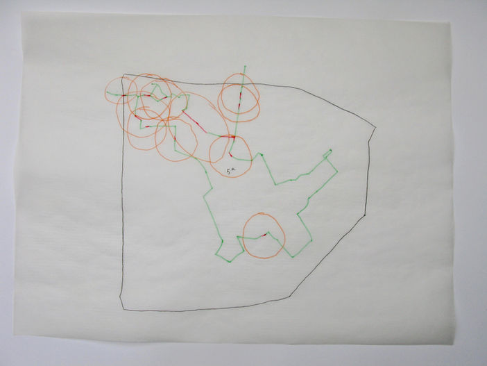 Karin created a series of maps. She attempted to plan the most ideal walks through the city in terms of avoiding pollution. The walk would go around each arrondissement and connect the route with all surrounding arrondissements based on her research on minimizing exposure to pollution. Avoiding as much as possible the boulevards and busy streets and focussing on the quiet streets and green spaces. The green lines would be relatively safe and quiet areas, the red lines show the most polluted boulevards and the orange lines indicated the larger radius around these arteries of pollution. As the orange cirkels on the map visualize, there where in fact many pollution infarcts presenting itself while planning the most ideal Pollution Walks around the arrondissements.